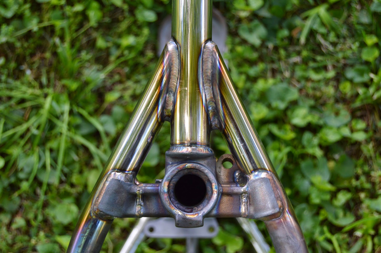 The frame is all polished stainless steel except for the castings. We cut most of the castings off of a pan frame but the neck is actually from a VL frame. The frame will be re-polished before final assembly and the castings will be painted. Check out the pics!